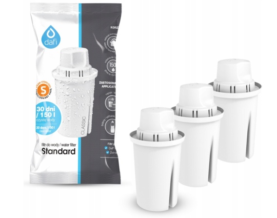 Filtr Standard Classic zawiera odpowiednio dobraną i systematycznie kontrolowaną mieszankę filtrującą składającą się z węgla aktywnego i żywicy jonowymiennej. Dzięki temu filtr znacznie redukuje twardość wody (powodującą powstawanie osadu z kamienia), zawartość metali ciężkich, związków chloru oraz innych niepożądanych substancji, które mogą wpływać na smak wody kranowej. Pasuje do większości dzbanków innych producentów.