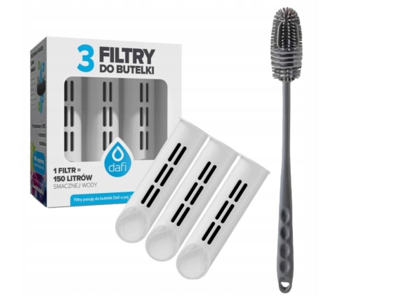 Zestaw 3 Filtrów do butelek Dafi Soft, Dafi Solid oraz Dafi Solid oraz uniwersalna szczotka do mycia butelek firmy ALNU