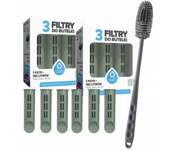 Zestaw 6 Filtrów do butelek Dafi Soft, Dafi Solid oraz Dafi Solid SZAŁWIOWY oraz uniwersalna szczotka do mycia butelek firmy ALNU.